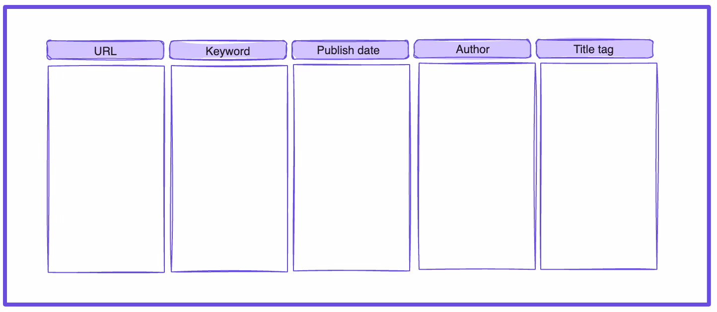 Regardless of what your goals are, there’s certain information you should include in every website content inventory: existing URLs, publish dates, primary keywords, and title tags and headers.