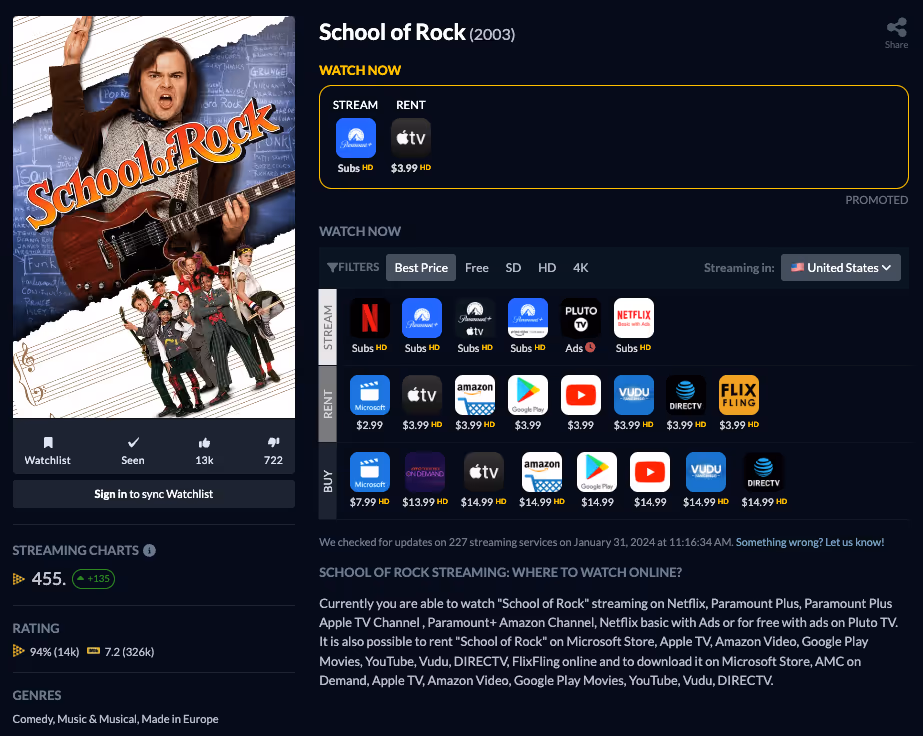 JustWatch — a site that tells visitors what streaming platforms a movie or TV series is currently available on — is a great example of a pSEO play: