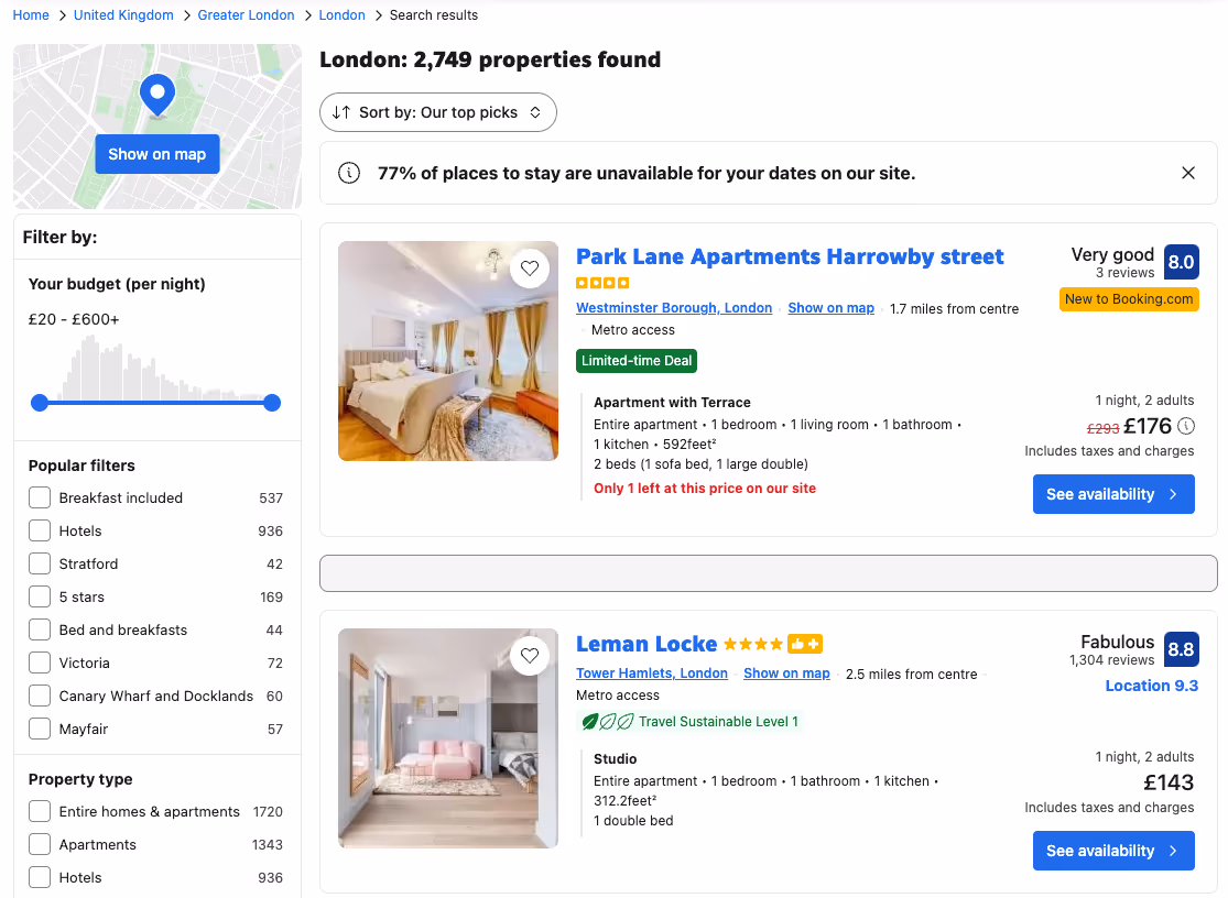 For example, if you’re looking for a hotel in London, you just need to head to Booking.com:
