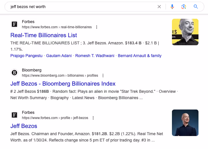 For example, if I search for “Jeff Bezos net worth,” Bezos’s Forbes profile is currently the third organic result (with the Forbes Real-Time Billionaires List sitting in the top spot):
