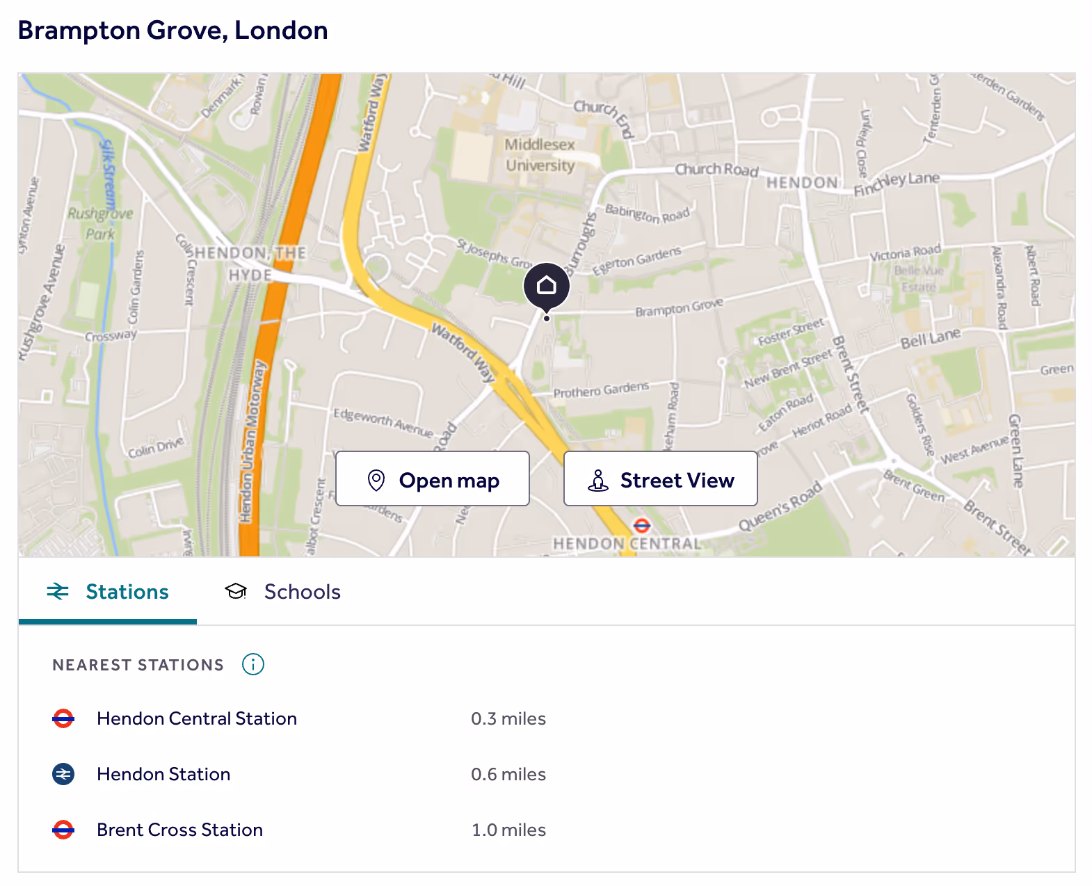 Users will also find a map showing where the property is in relation to the nearest public transportation stations and stops and in relation to schools: