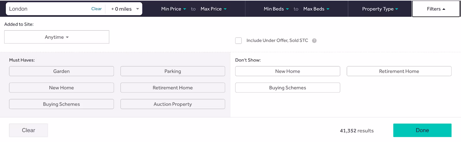 The location pages allow users to filter results by dozens of criteria, from maximum price to whether or not the property is newly built: