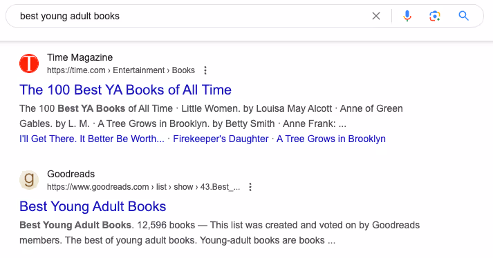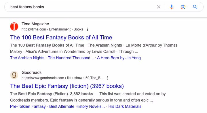 For example, Goodreads is built on UGC: its users’ book reviews and “best of” lists. And it’s user-generated lists appear in the top three organic results for keywords like “best fantasy books”: