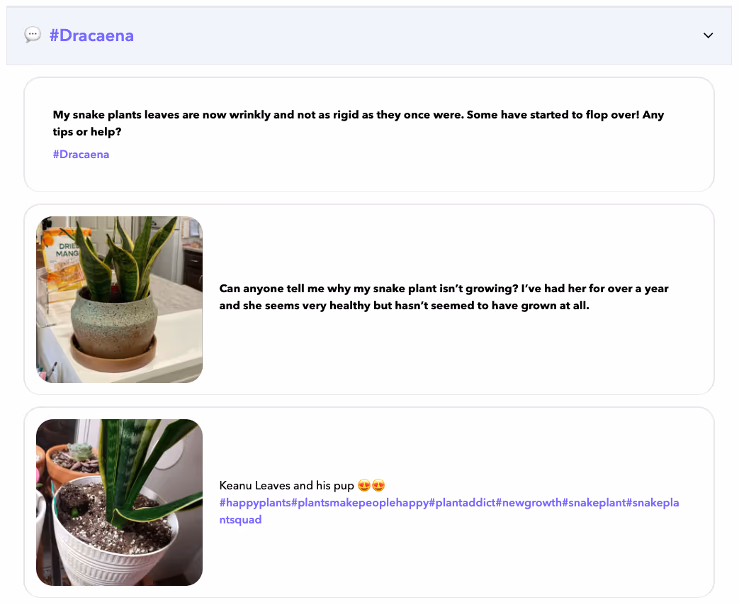 This gives these programmatically generated pages a serious social proof boost. Plus, it acts as an SEO-friendly FAQ section — for example, with content that answers the question “Why is my snake plant not growing?” appearing on this particular page.