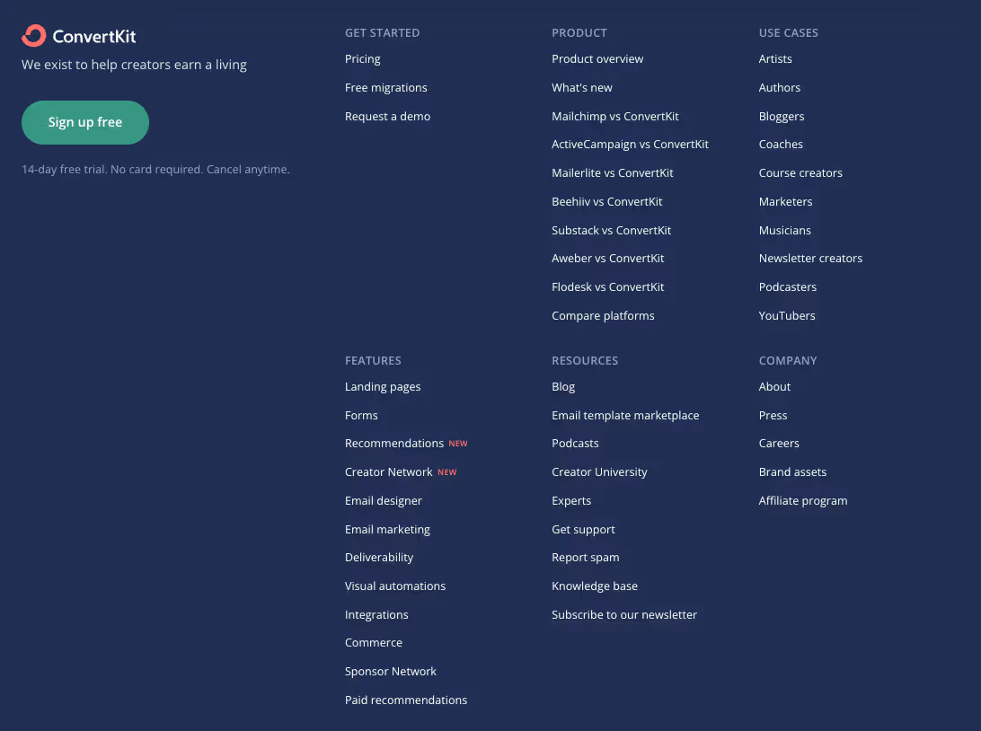 Even if product-led SEO is a great fit for your business model, that doesn’t mean blog posts can’t help move the needle on your organic growth strategy. Take ConvertKit, the creator marketing platform, as an example. A glance at the site’s footer shows that the company’s SEO strategy involves both product-led content (an Email template marketplace and an Integrations landing page) and “traditional” top-of-funnel content (a Blog and Knowledge Base) and bottom-of-funnel content (its Product page and Use cases pages):