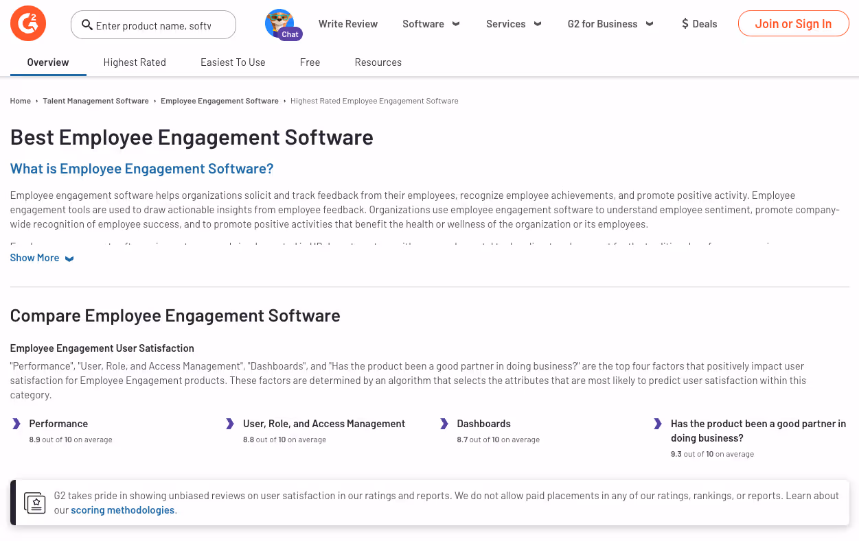 The site features comparisons of software organized by category. For example, searching for “best employee engagement software” leads me to this page on the G2 site: