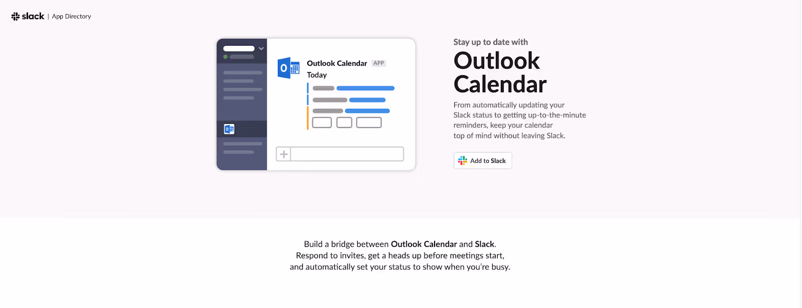 The Slack App Directory is a great example. For example, the top result for “connect Slack to Outlook calendar” is this page:
