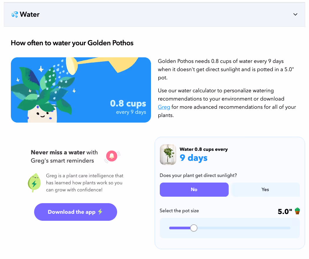 The page includes programmatically generated content such as guidelines for how often to water a particular variety of plant (depending on whether it's in direct sunlight and how big of a pot it’s in):