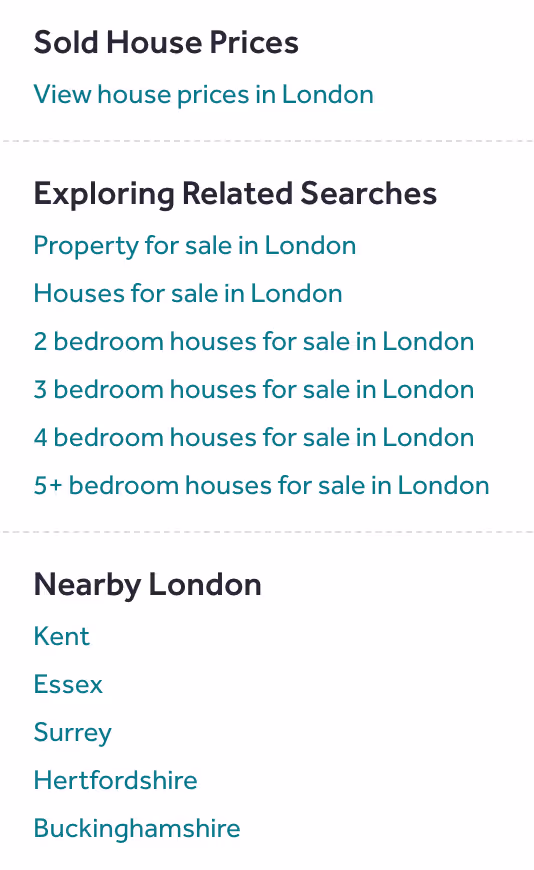 Each city page features dozens of internal links to programmatically generated pages that track house prices in the area, pages that target long-tail keywords, nearby location pages, and more: