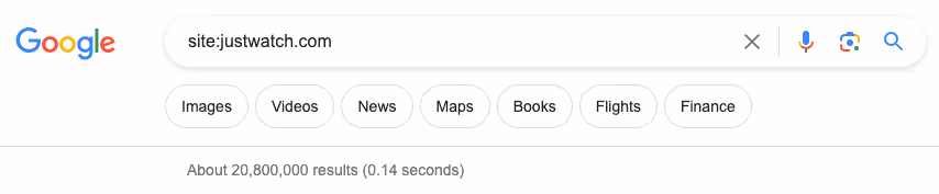 And a “site:” search reveals that JustWatch has generated more than 20 million pages using this template: